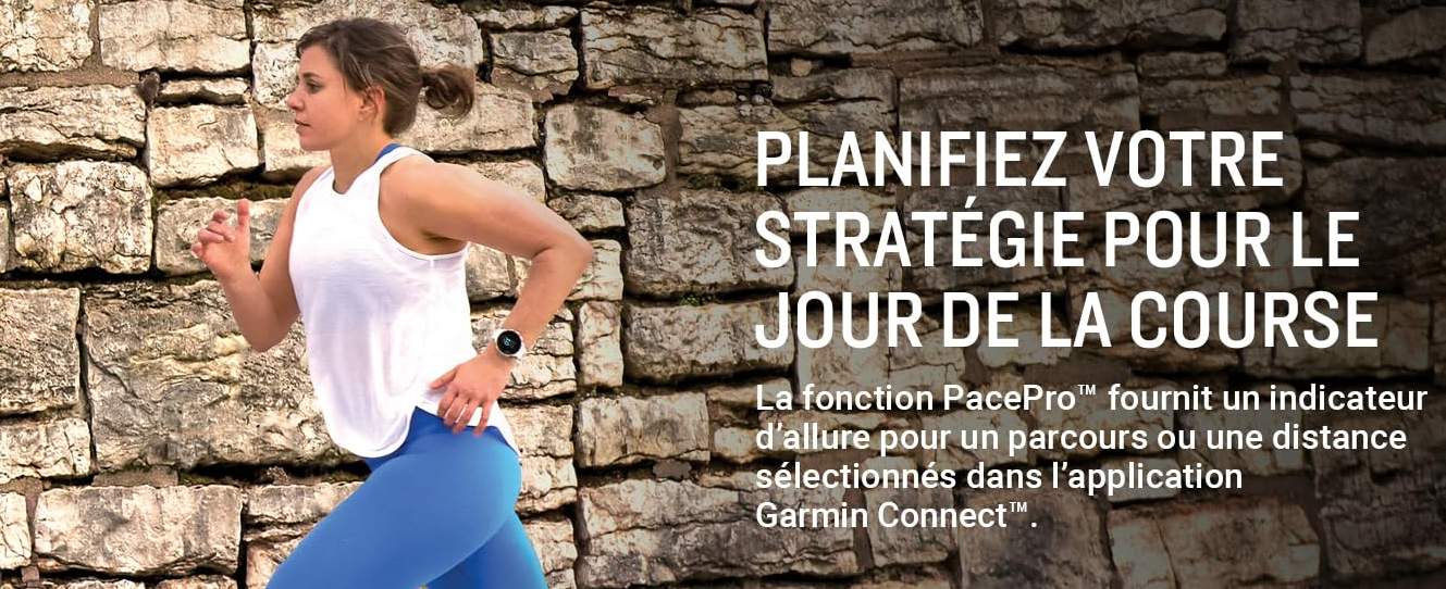 Inclut les fonctions PacePro, Temps de fin estimé et Temps de récupération pour une gestion optimale de l’effort.